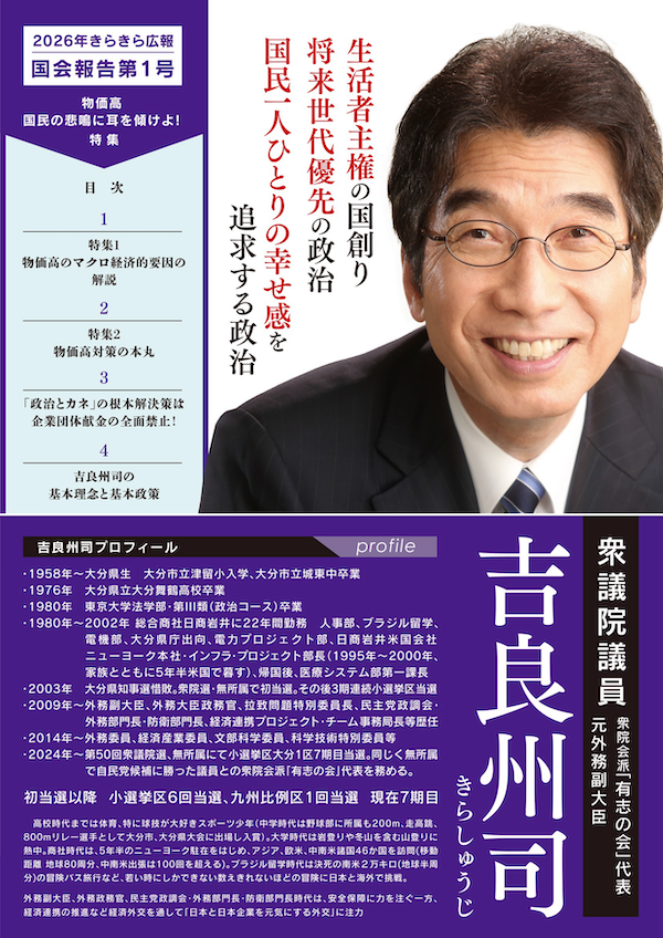 広報誌「キラキラ広報」では、吉良州司の思索や政策などを掲載しています。特に読んで戴きたいテーマについては「思索集」ページで特集しています。以下より、2010年以降のすべての広報誌(PDF)とその他資料集をご覧戴けます。