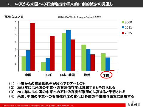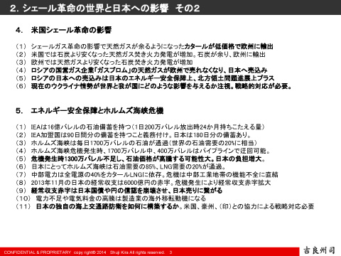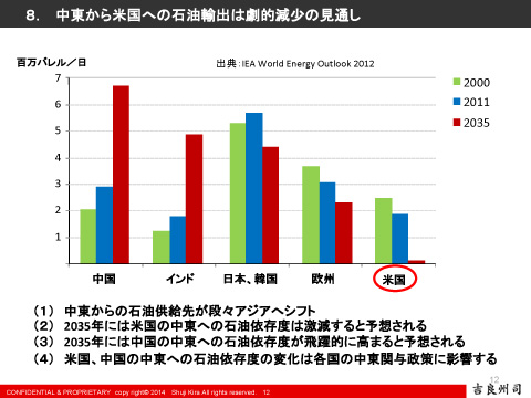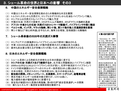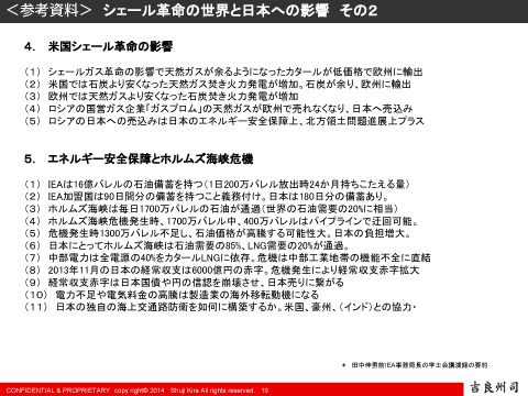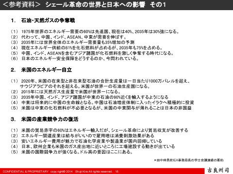 * このシェール革命は世界のエネルギー市場を変化させ、世界の政治経済に大きな影響を与えつつあります。その詳細をこのメルマガで書く紙数的余裕はありませんが、本記事の下部に掲載したスライドに、かなり詳しい図やグラフや説明文章を掲載していますので、是非参考にしてください。