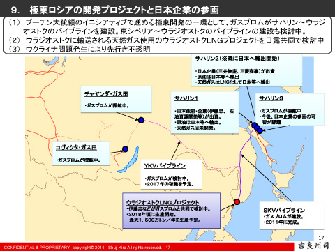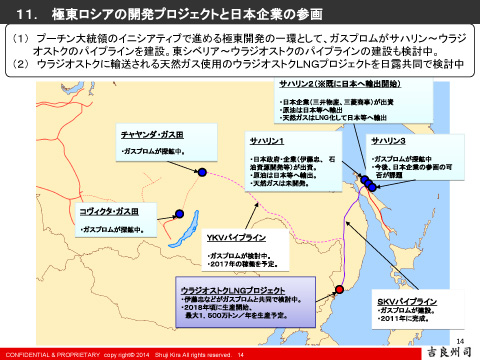 その意味では、米国のシェール・ガス、豪州、カナダの天然ガスという政情が安定している国々からの供給を増やすことは重要な国家戦略となります。これに加え、ロシアのサハリン、東シベリアからの石油、天然ガスを安く安定的に確保する手も打たなければなりません。