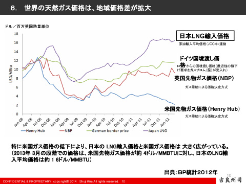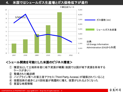 その第1は、現在進行中のシェール革命(米国ではじまった地中の頁岩層シェール層から抽出できるようになったシェール・ガスとシェール・オイルの産出が世界のエネルギー市場にもたらす革命的な影響)が、特に世界の天然ガス価格に低下圧力をかけていることです。