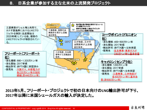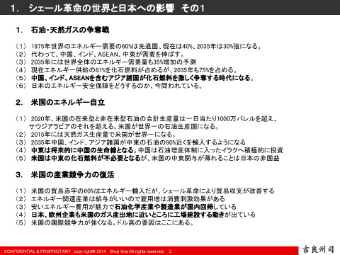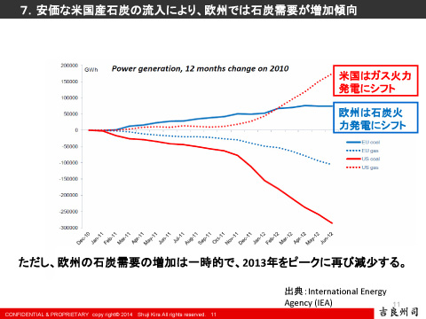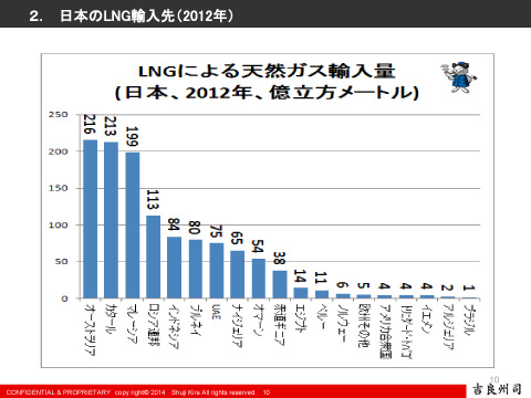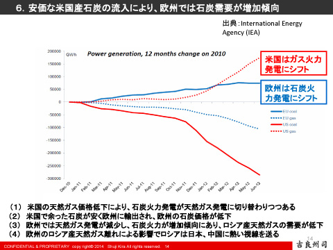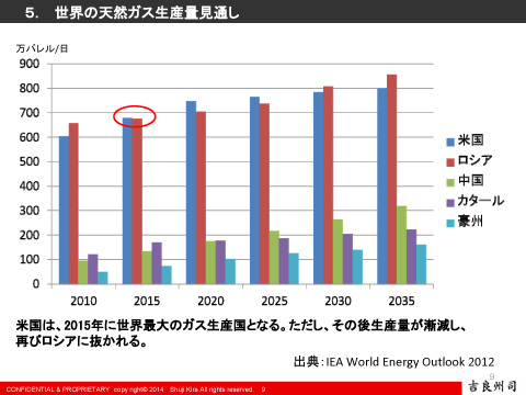 話が少し横道に逸れます。今、ウクライナ問題が世界の注目を集めていますが、このシェール革命により最も大きな影響を受けている国がロシアです。天然ガス価格の低下圧力により、ロシアの天然ガスは以前のような量と価格で欧州に売れなくなりました。それ故、ロシアはあらたな大口需要先として我が国や中国に熱い視線を送ってきていたのです。