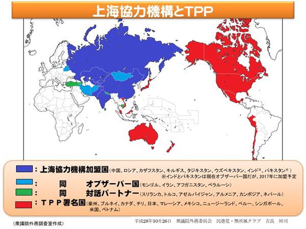 これに対して、私はTPPが上海協力機構に対抗しうる地政学的枠組みだと(配布資料の世界地図を見てもらいながら)主張し、次のテーマであるTPPの議論へと展開しました。