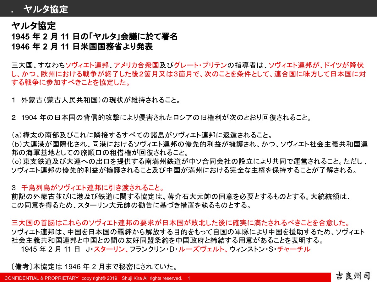 ヤルタ会談に参加した米国ルーズベルト大統領は会談後に死去し、トルーマン大統領へと引き継がれます。トルーマン大統領になってからのある段階では、米国が最北端の4島を除く中部千島列島を、米国の独占的な軍事行動の範囲として、ソ連にもそのことを認めさせていた時期があるのです(ポツダム会議における米ソの軍部首脳による合意)。それにも拘わらず、ヤルタ会談以前から対日参戦を画策していたスターリンは、巧妙にトルーマン大統領と駆け引きして、最終的には北方領土を占領するのです。