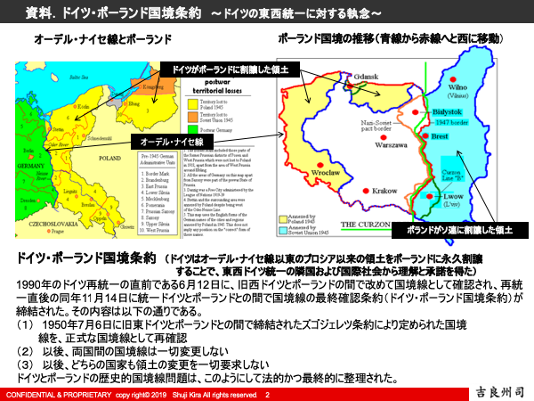 一方、「北方領土は間違いなく日本の固有の領土」であり、そのことをロシア側に主張し続けることはいいが、大戦時の同盟国であったドイツは、ドイツ・ポーランド国境条約の締結により、ドイツの(日本に置き換えれば)奈良に当たる固有の領土「東プロシア(ケーニヒスベルク)」を、ポーランドに永久割譲することによって東西統一を果たしています。その意味で「北方領土は日本の固有の領土」であることは間違いないが、この「固有の領土論」が世界的に通用するかどうかは、疑問があると投げかけ、外務省発行の「われらの北方領土」に、同盟国ドイツの大戦後の国境変更についても、国民理解醸成のために加筆すべきだと主張しました。