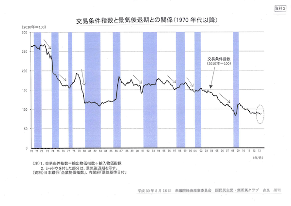 <図の説明:折れ線グラフが交易条件指数で、矢印(→)が右肩下がりの場合は交易条件の悪化、右肩上がりの時は交易条件の改善を表す。シャドウで付した部分は景気後退期。これによると、1985年から87年のプラザ合意直後の一時期の例外を除けば、基本的には交易条件が悪化した後は景気後退局面に入ることがわかる。>