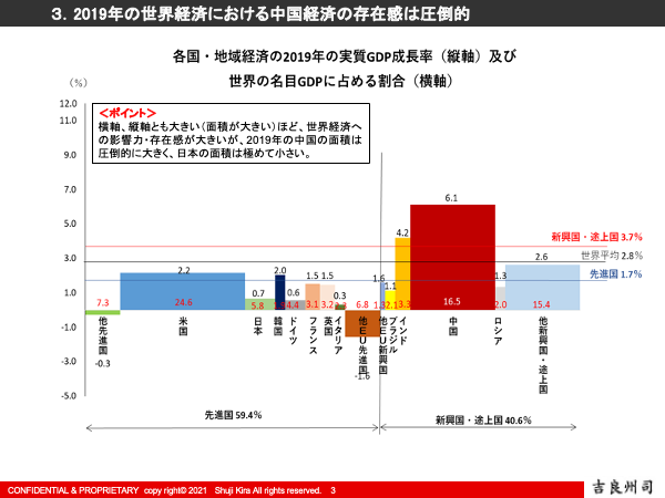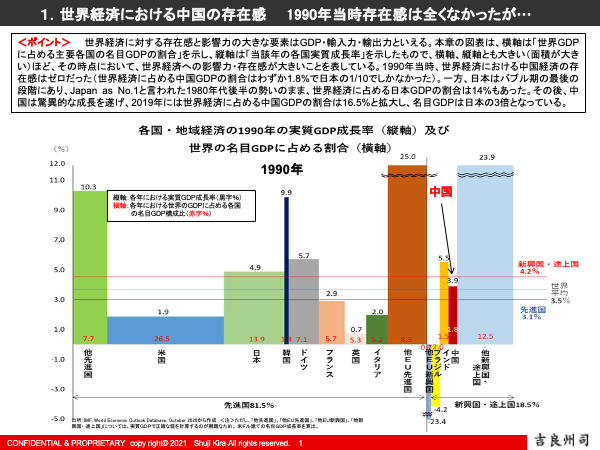 中国を正しく理解し、正しく恐れ、正しく対応していくため、本メッセージでは、まず、中国の経済的実態、特に世界経済における中国経済の存在感について、データを示しながら、お伝えします。