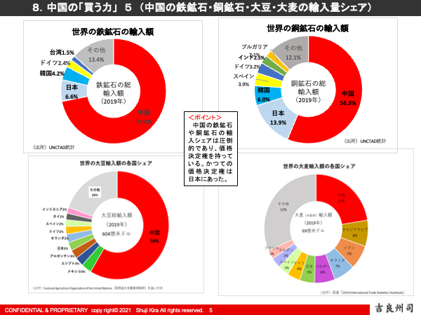 嘗ては、その品質と生産量の両方において、日本の製鉄メーカーが圧倒的な存在感を示し、鉄鉱石生産の世界最大手であるブラジル・バーレ社と日本の製鉄会社間で決める鉄鉱石価格が世界標準価格となる「価格決定権」を持っていましたが、現在ではその圧倒的な生産量にものを言わせて、中国が価格決定権を持っています。重工業の基幹原料である鉄鉱石の中国の輸入額シェアは72%、銅鉱石は同56%と圧倒的な影響力を持っています。