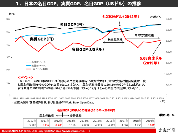 1.第二次安倍政権時の米ドル・ベースGDPは一度も民主党政権時のGDPを上回ったことがない(民主党政権時2012年6.2兆ドルから2019年は5.08兆ドルと1兆ドル減少)