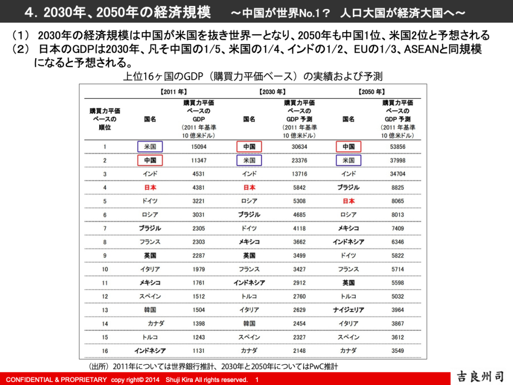因みに2050年のGDP上位10か国は、1位中国、2位米国、3位インド、4位ブラジル、5位日本、6位ロシア、7位メキシコ、8位インドネシア、9位ドイツ、10位フランスとなっており、BRICS中4か国(中国、インド、ブラジル、ロシア)がベスト10入りしています。