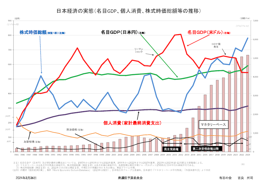 円安の影響で、世界における日本円の価値、購買力が大きく落ち込んでいます。その結果、ガソリン代、電気代、ガス代、食料品など輸入物資の高騰により、可処分所得が減り、国民生活が苦しくなっています。それゆえ、ドルベースのGDPが落ち込む中で、円ベースのGDPが拡大したことを成果として強調しないでいただきたいと思います。