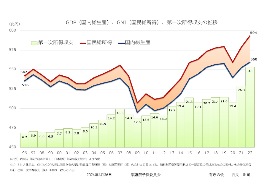 三点目、企業収益が拡大したことについて、資料2枚目<吉良州司HPURL GNIとGDPと第一次所得収支>を御覧ください。