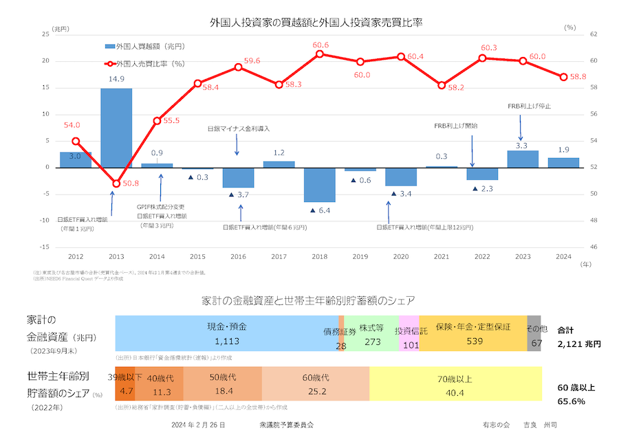 なお、現在進行中の株高について、資料の3枚目<吉良州司HPURL 外国人投資家の買越額と売買比率>を御覧ください。