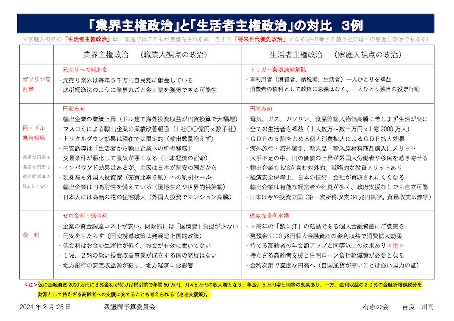 では、どうすれば国民生活は向上させることができるのか。もう時間がないので、本来は、業界主権から生活者主権政治に転換すべきということで詳細を説明したいのでありますが、時間がありませんので、是非、資料4枚目<吉良州司HPURL 業界主権政治と生活者主権政治の対比>、業界主権政治と生活者主権政治の対比を御覧いただきたいと思います。