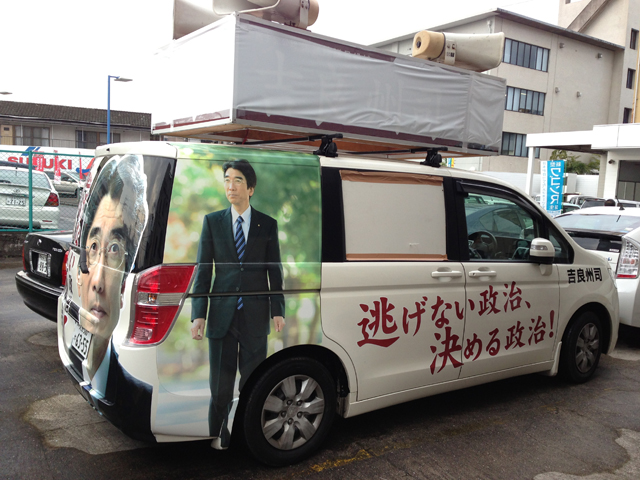 選挙カーの準備も整いました。今回も吉良州司の大きな顔写真がラッピングされ、遠くからでも目立つ作りになっています。