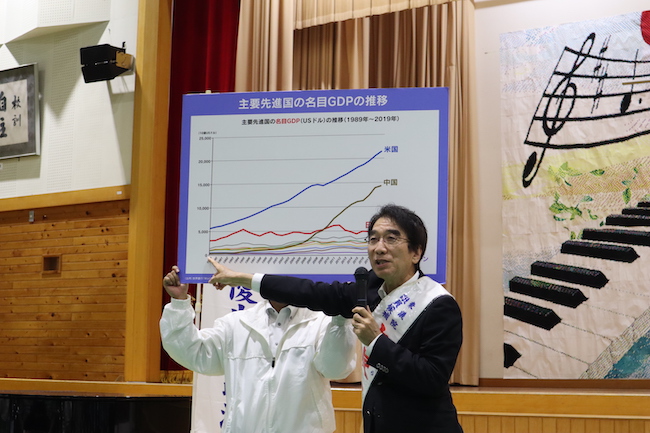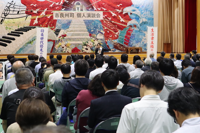 夜は最後の個人演説会が坂ノ市中学校で開かれ、「失われた30年の責任は誰か?」について語る吉良州司の訴えに、多くの参加者が熱心に耳を傾けていらっしゃいました。