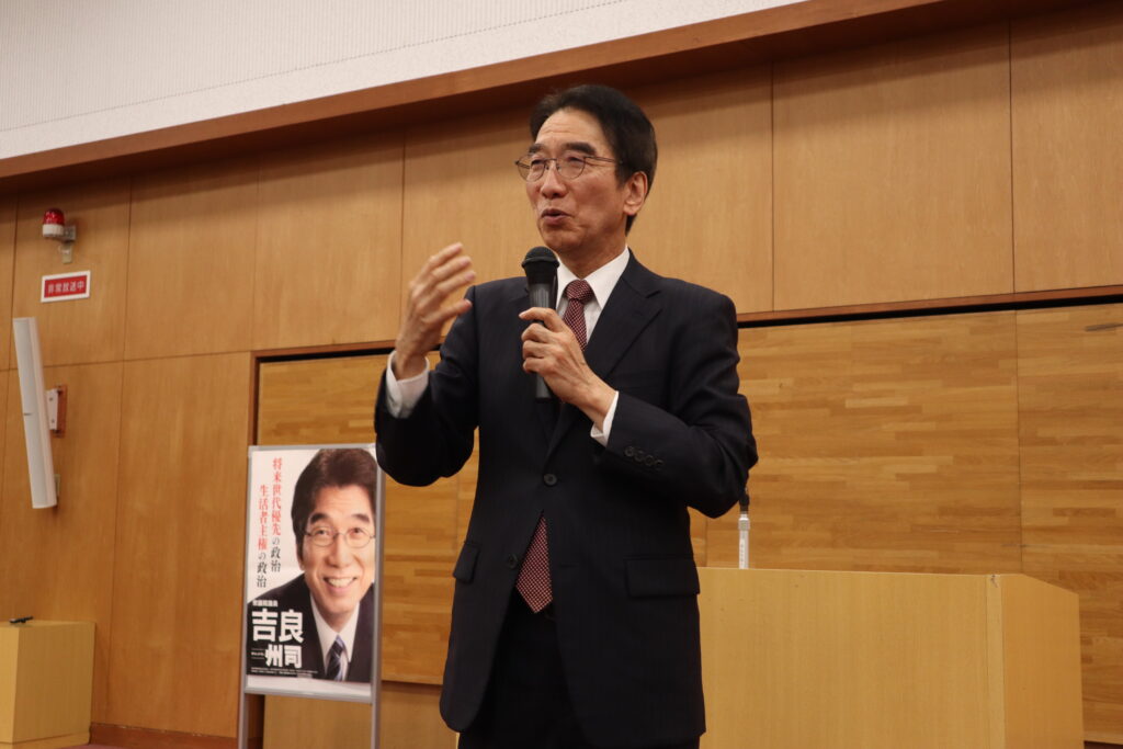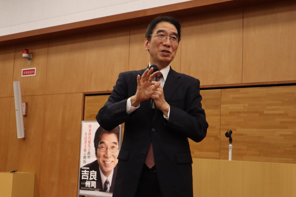 吉良州司は「過去30年間日本を全く豊かにしてこなかった自民党による業界優先政治から、生活者主権、生活者優先の政治に大転換しよう」と訴えました。