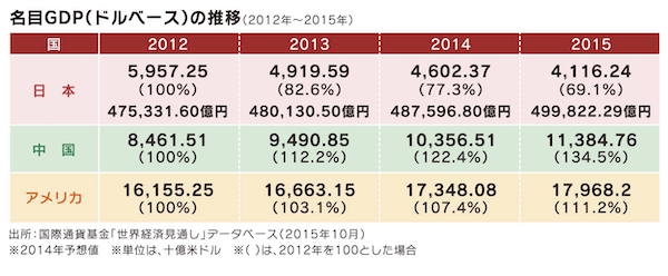 円安により大手輸出企業の業績は改善したものの、地方の経済、暮らしは一向によくならず、今後よくなると感じている地方住民もほとんどいません。ご存知でしょうか。国際的にその国の経済力の指標とされる米ドル・ベースでの日本のGDPは円安により大きく減少しています(名目GDPは2012年の5兆9573億ドルから2014年4兆6024億ドルと約 %下落、2015年の予想は4兆1162億ドルと約 %下落。IMF統計)。加えて、足元では原油価格の下落により最悪の状態は避けられていますが、我が国の生存に不可欠な資源・エネルギーは米ドルでしか調達できないため多大な国富を国外流失させています。これが続くと貿易赤字の拡大や経常収支の悪化を招き、その先には円や国債の暴落、ハイパーインフレ、金融機関の破綻といった将来的潜在的リスクが待ち受けています。また、過度な円安は、世界から見た日本人の労働の価値や生産物の価値を大幅に下落させています。だから中国の人達が爆買いしているのです。海外の人から見ると、日本人の人件費や日本の商品が安いのです。